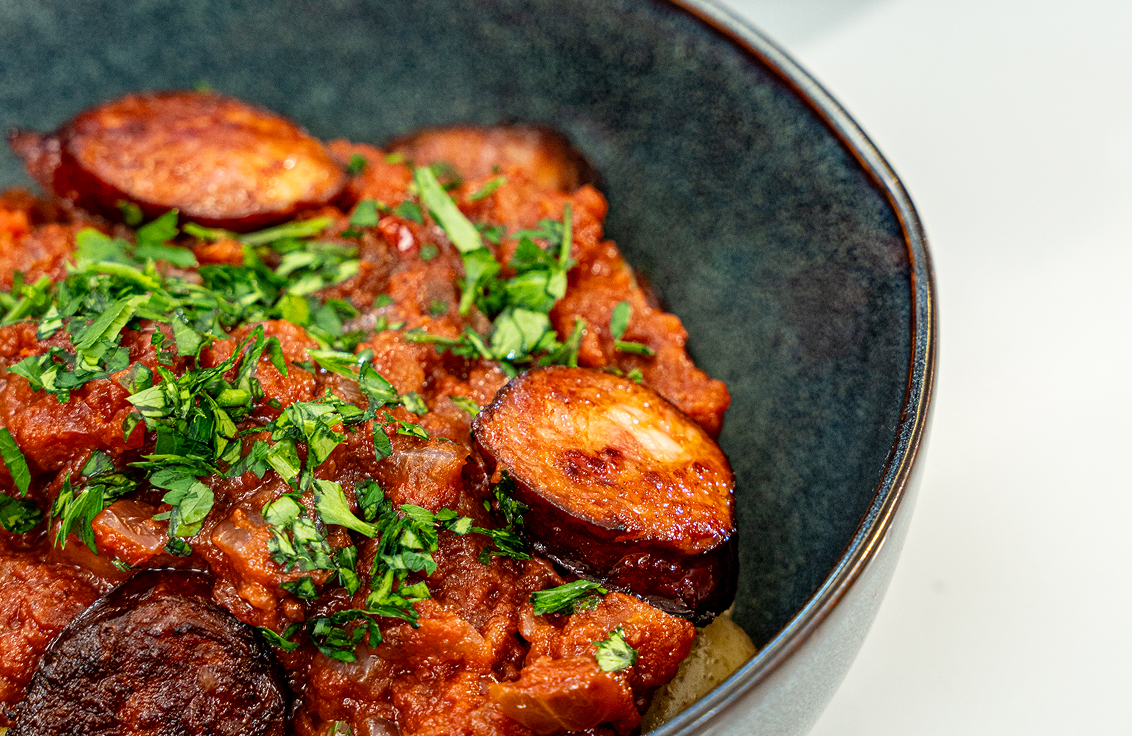 - Pan-sear sliced Hartlief Chorizo until the oils release and edges caramelise.